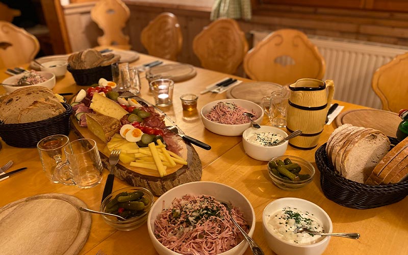 Preparamos una tabla con quesos regionales (Bergkäse), pan artesanal, mantequilla de granja y vegetales frescos, manteniendo el estilo tradicional del Vesper.